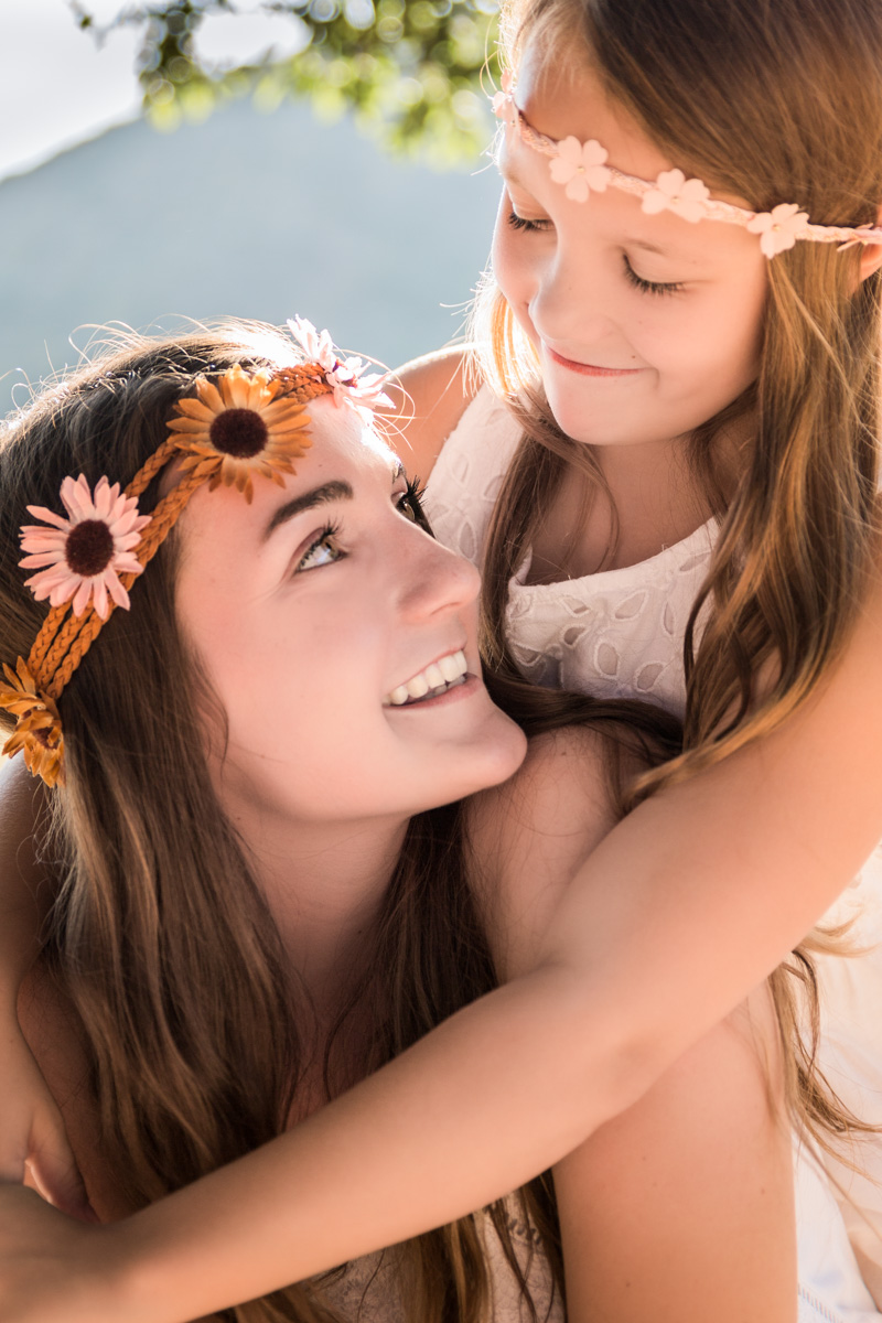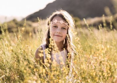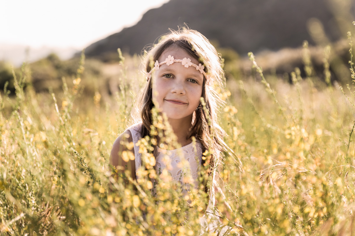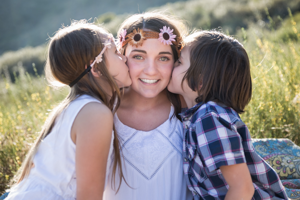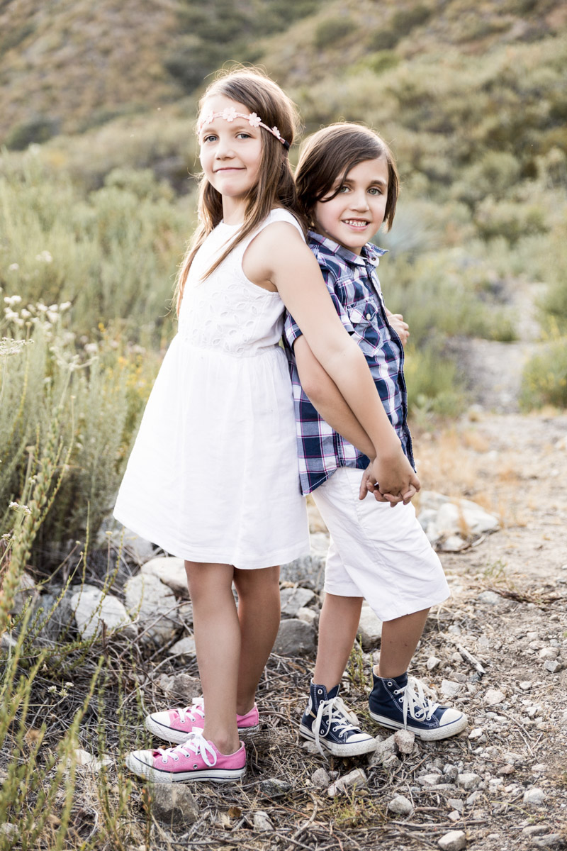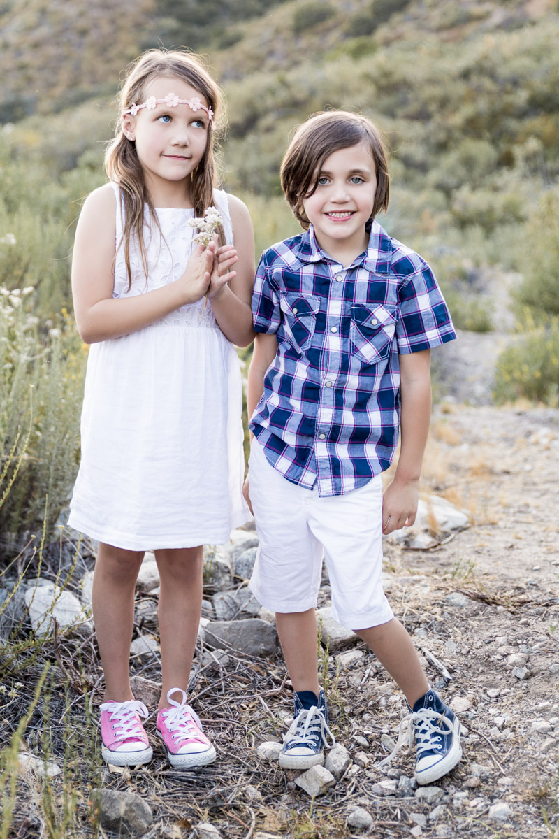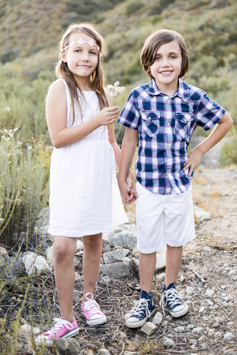 I loved that all the flowers were in bloom. It made for a great shot of Page smelling the flowers and Parker giving one to his sister. Together we captured the love between Maddie and her little sister, as well as Page and Parkers unique personalities, and the special relationship they all share. We shot at my favorite time of the day, golden hour. This is when you get that beautiful back light that makes everything warm and magical. You can almost feel it in their images.