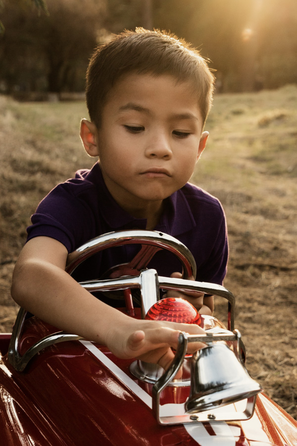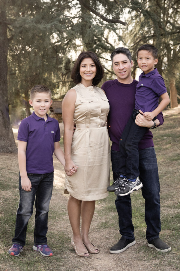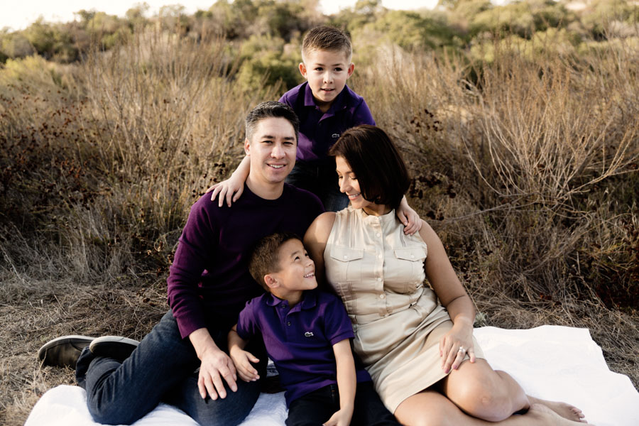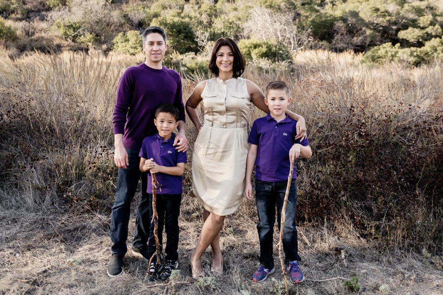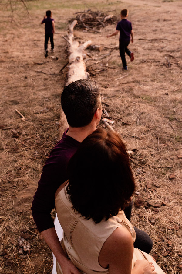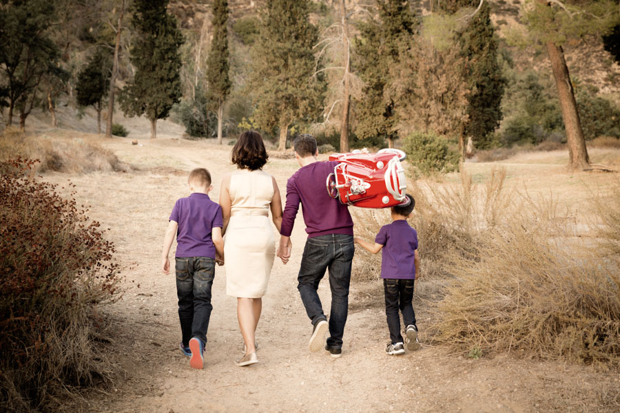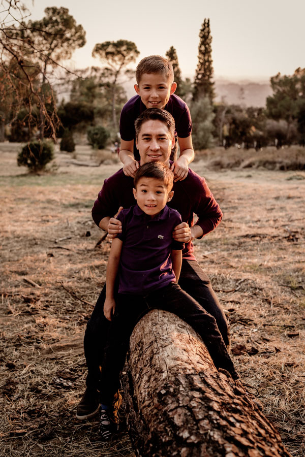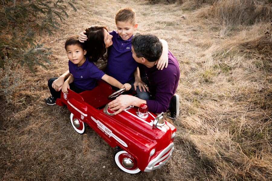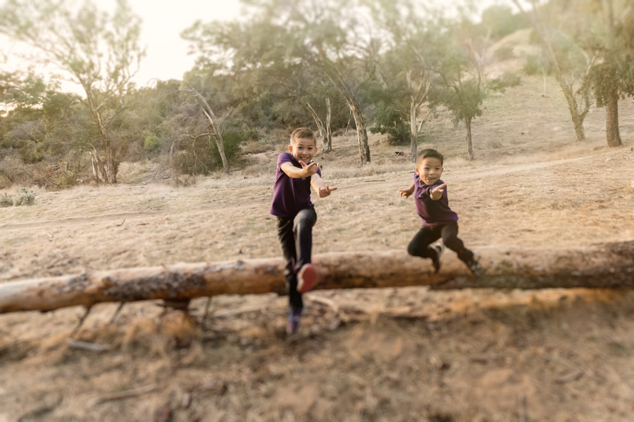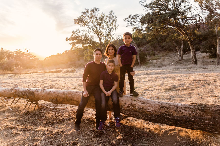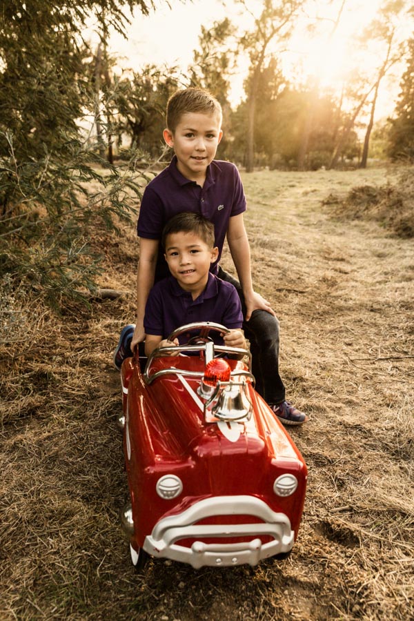 This sweet family bid on my portraiture session at their schools annual silent auction in Sierra Madre. When Monica called me for her pre-session consultation we had so much fun talking and planning their shoot. When she told me they had two boys ages 6 and 8, I asked her if they had any special sentimental toy. She said yes, their fire truck. We decided they should bring it on the day of the shoot. It was the perfect moment with the sun setting behind them to capture the beautiful colors and freeze a moment in time! The boys will outgrow their fire truck but this photo will always bring back a sweet time in their life. Keeping a photo shoot “fun” for kids can sometimes be challenging, so to keep the boys entertained I suggested they jump off a log pretending to be their favoriite super heroes. Success! They had a blast! At the end of the day, the family photo of the four of them with the truck ended up being their favorite!