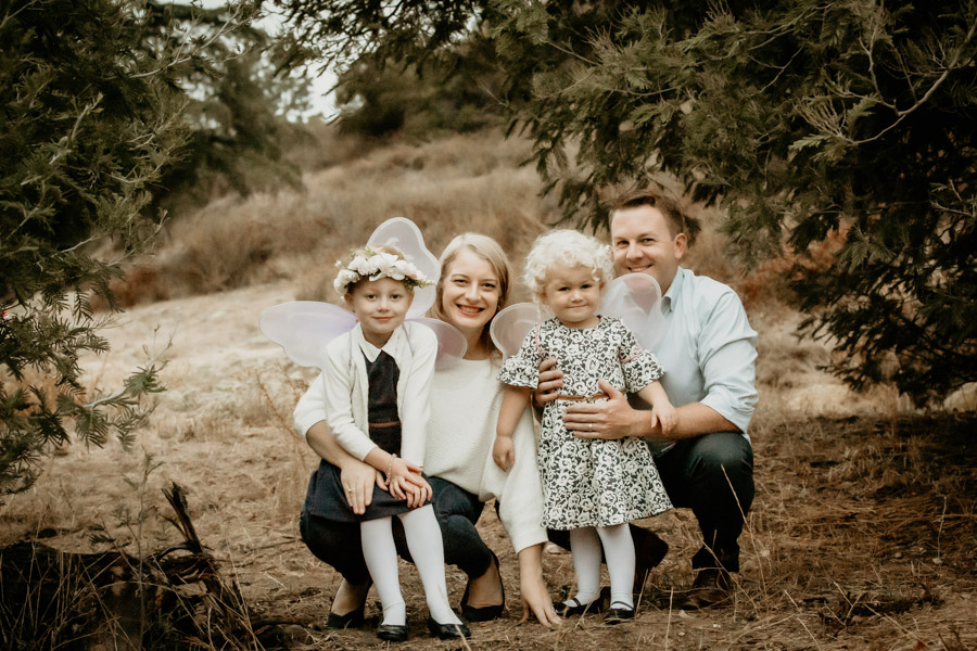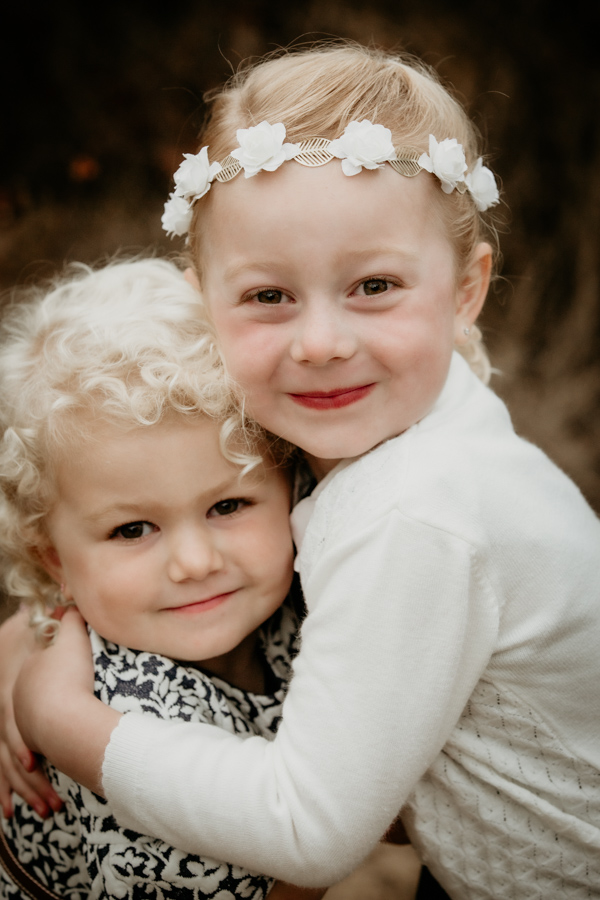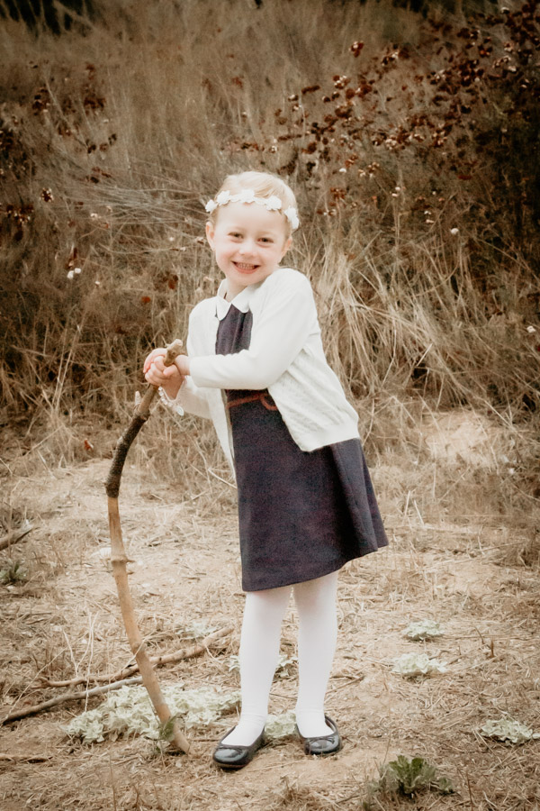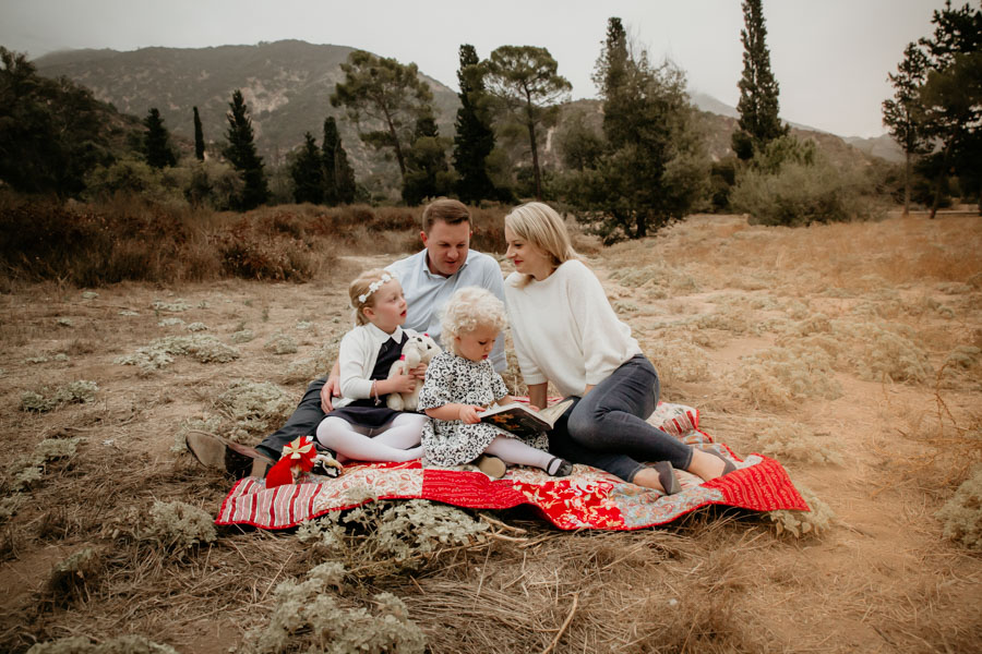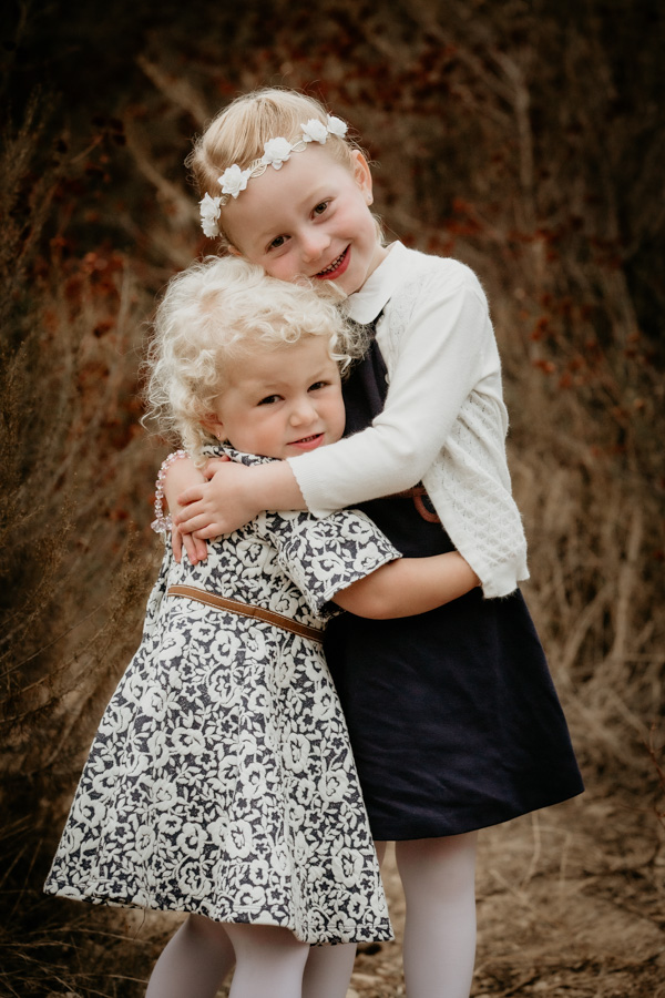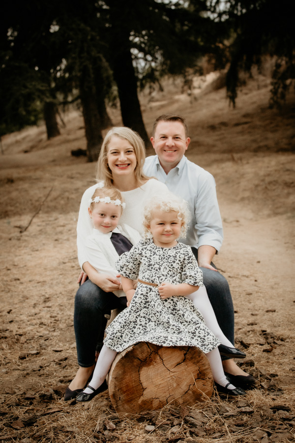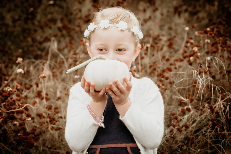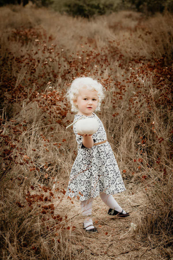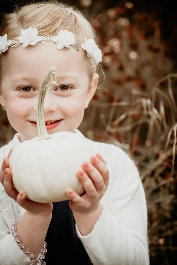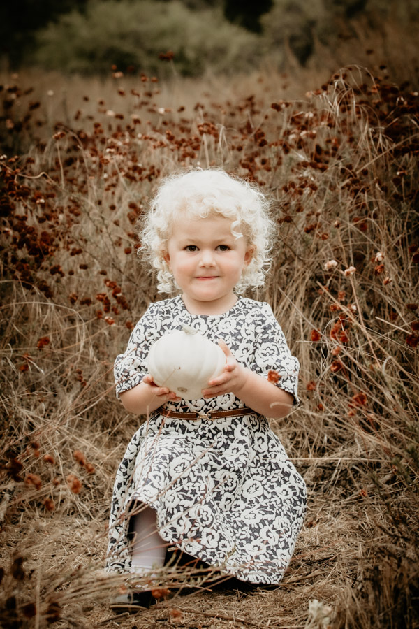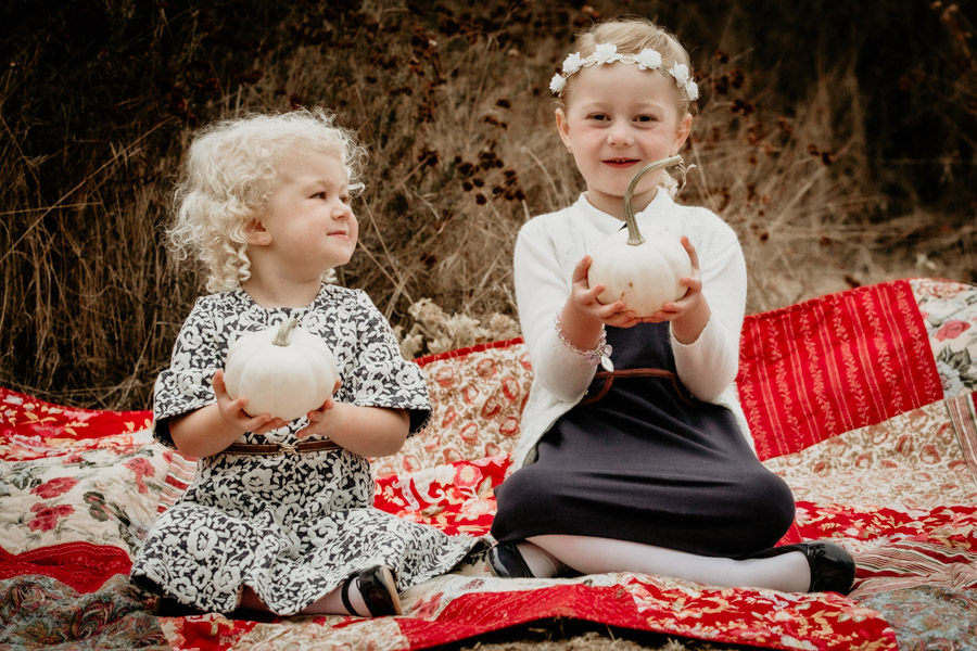 Just looking at these two little girls makes me smile 🙂 Kudos, mom and dad! This little family was so adorable! We met at one of my most favorite locations in the mountains of Pasadena for their family portrait session. It was Fall and a couple of weeks before Thanksgiving. As I was running out of my studio, I glanced over and saw these two white pumpkins and thought… how cute would they be for the girls! Loved these sisters individual personalities, and you can absolutely tell how much little one loved on her big sis!